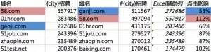 图中可见,对于城市+招聘的词,加#搜索时(或说实际排名),赶集略好于58同城。而加上点击影响之后,赶集的排名远差于58同城。这就是SEO无奈的典型不可抗力之一——用户喜欢竞争对手的网站而更多的点击,就算自己排名SEO做到好于竞争对手,0终结果却还是会很糟糕。