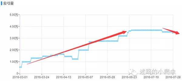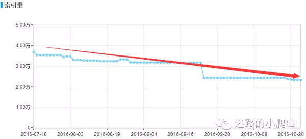 如上图小编是今年三月份开始接手的这个网站项目,当时并没有通过逆向思维去解决网站存在的收录问题,只是经验性的简单分析了一下网站的日志,在站长后台增加了sitemap推送和在服务器上部署了主动推送功能,短时间内的确效果明显,该频道的页面收录呈现良好的上升趋势,可是通过图表可以看出,收录量在达到6月份的时候一直到7月份中旬没有进行任何明显的变化,从7月中旬之后小编当时就有一种危机感,职业上的直觉告诉我,接下来一段时间该频道的收录会呈现大幅下降的趋势,结果果不其然,如下图: